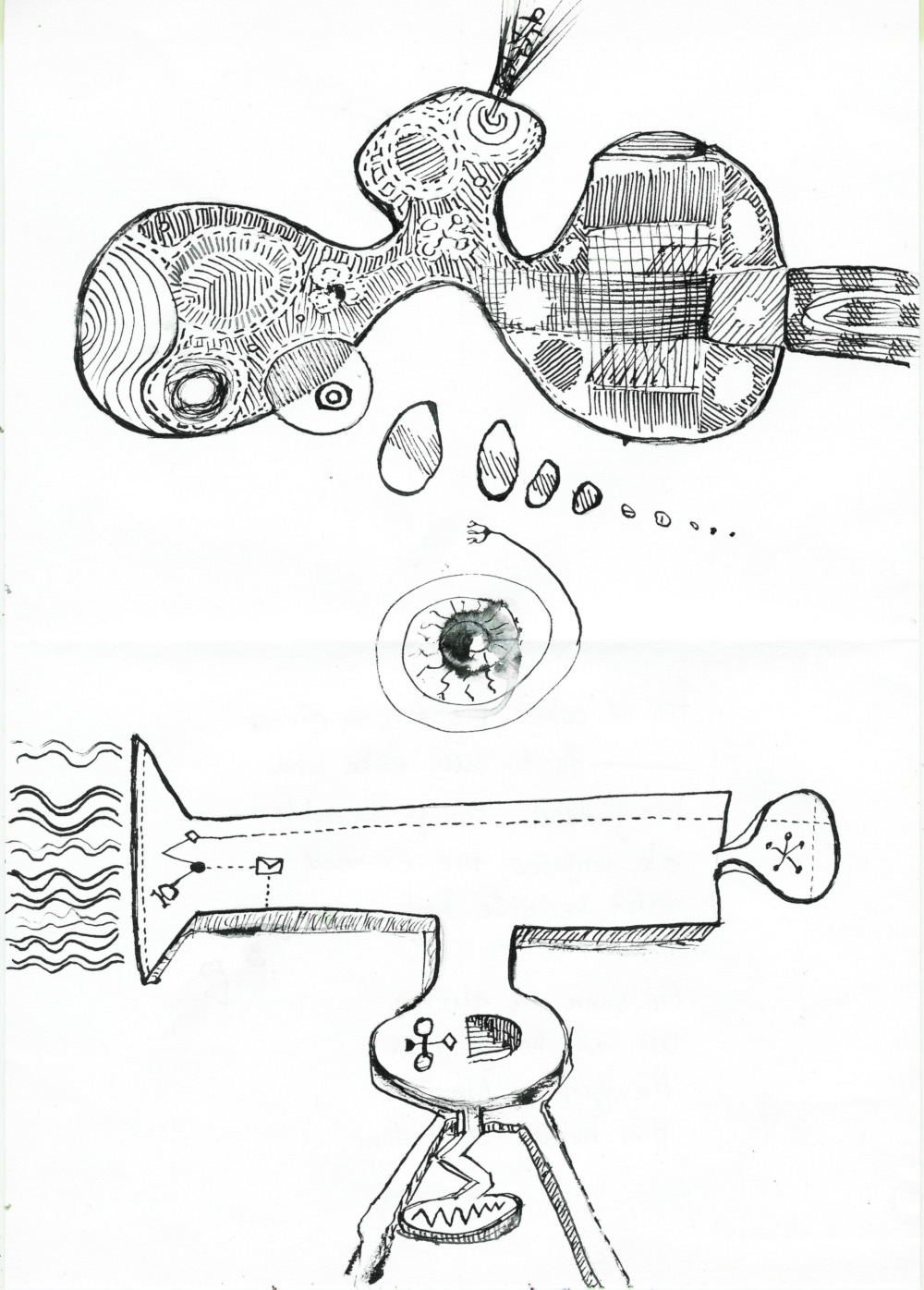 Two ink drawings. Left: Sisyphos Dynamics, Right: Sisyphos' Holiday. I also have unfinished sketches for a work of chamber music with the latter title. Why ever finish a work like that?